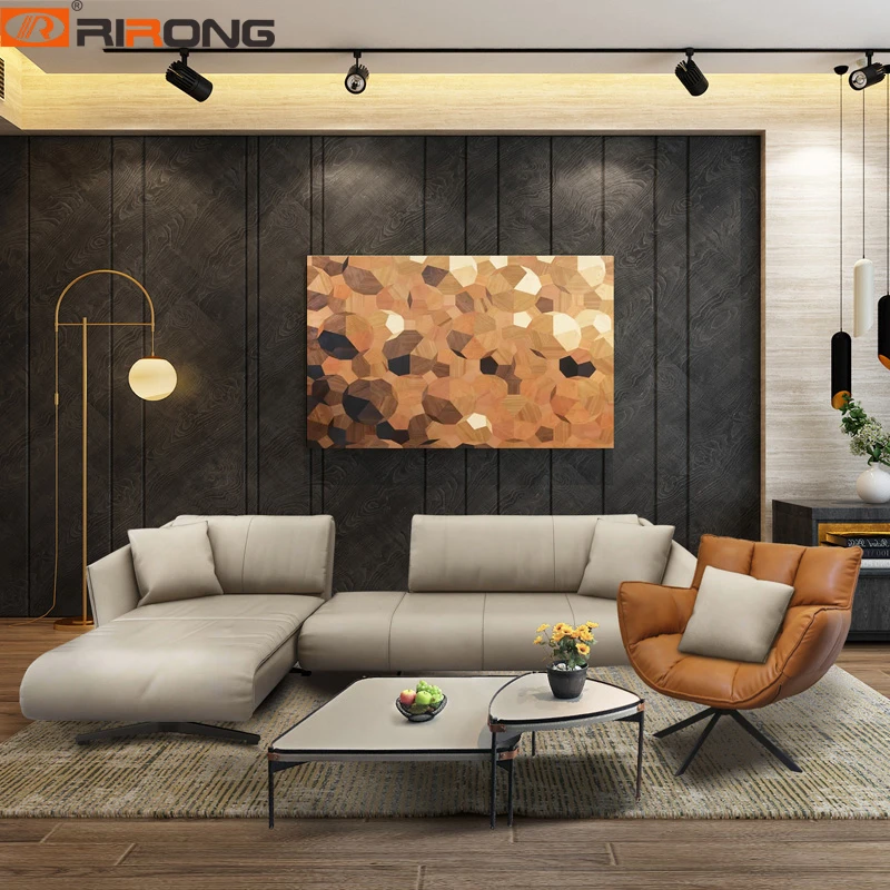It includes a brown tufted leather sofa and light wood coffee table over a beige rug.